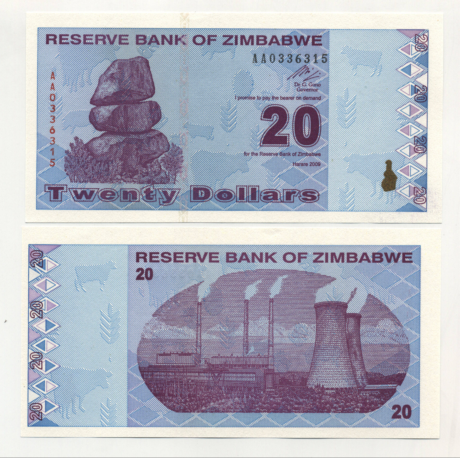 Zimbabwe 20 Dollars 2009 Pick 95 UNC Uncirculated Banknote